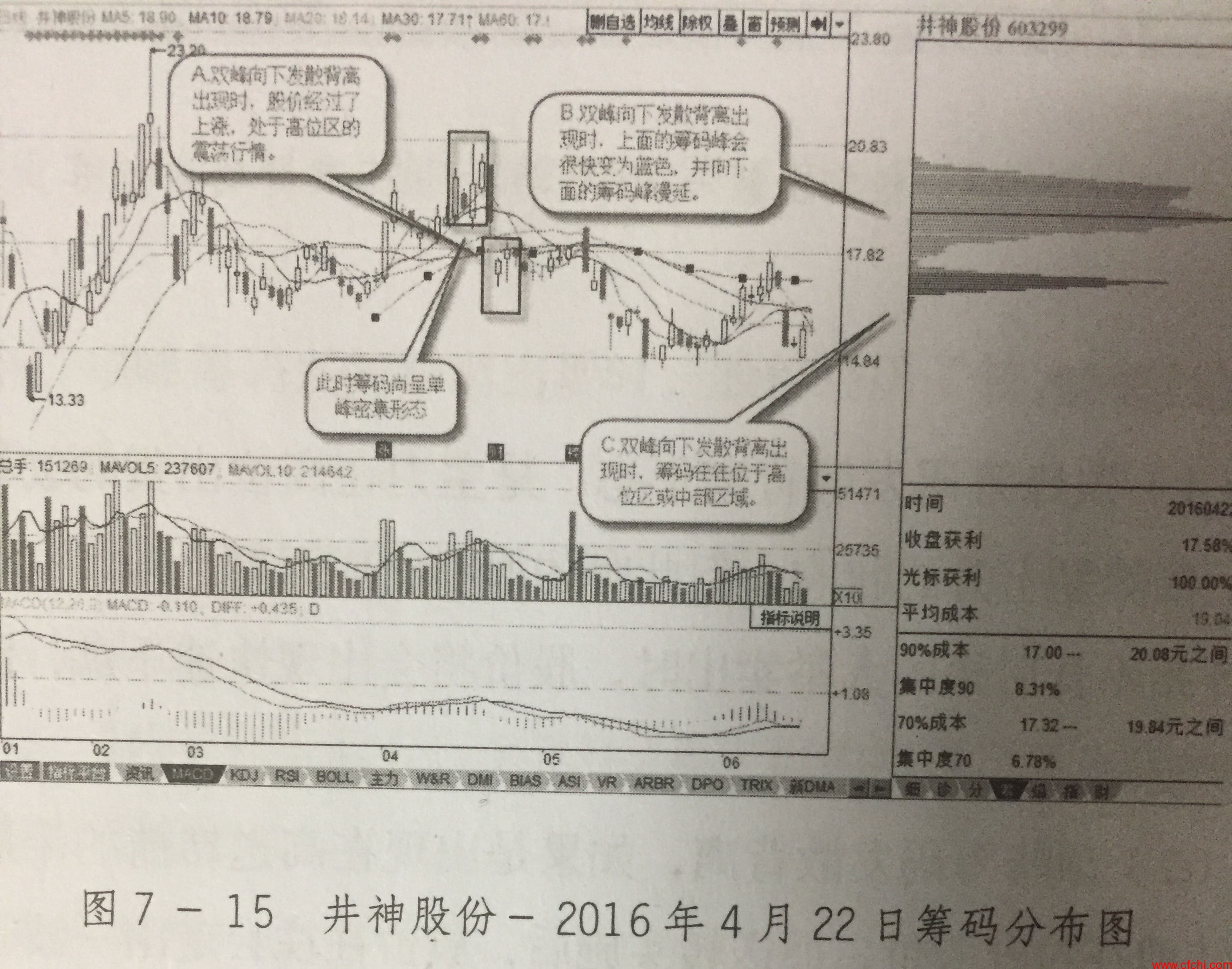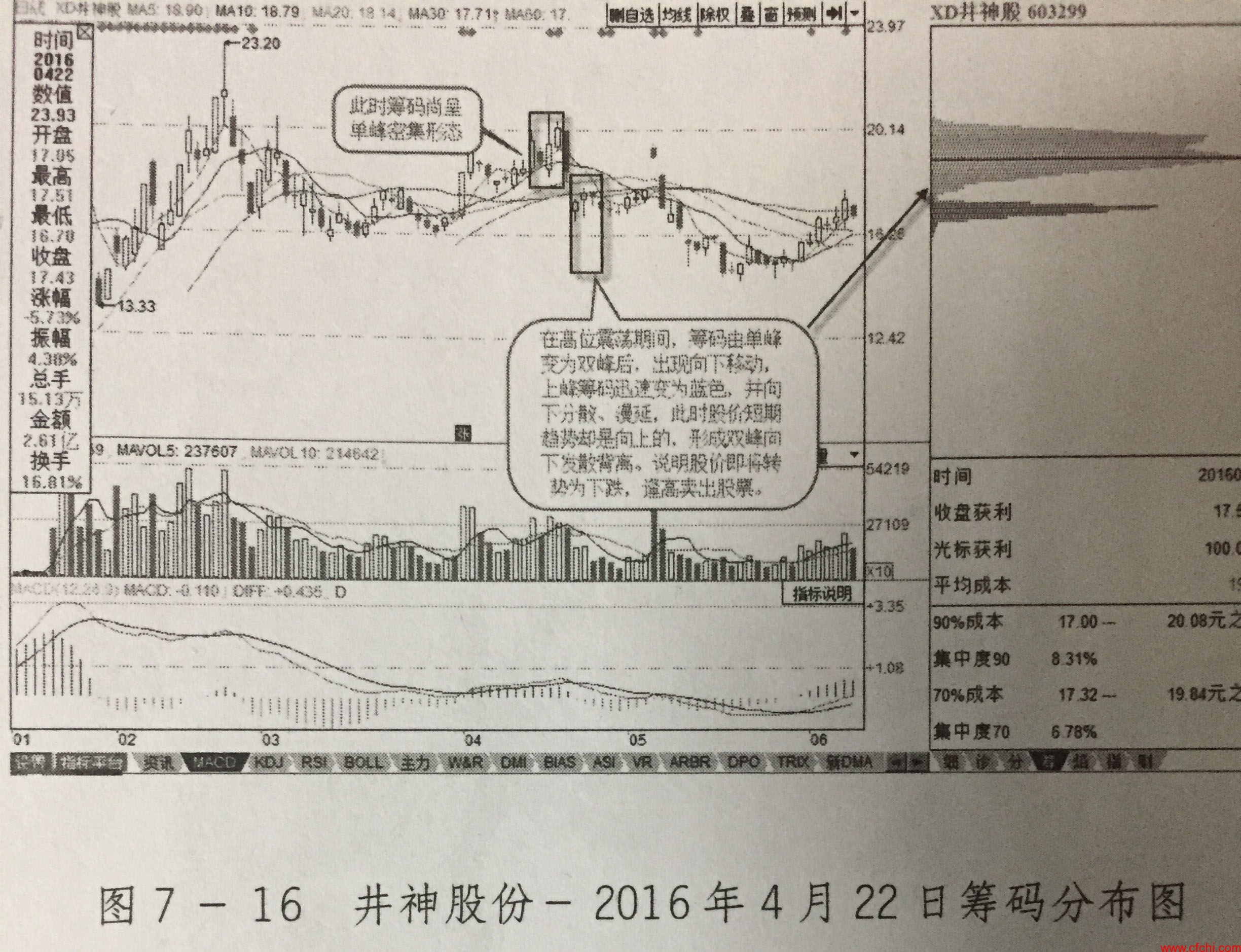 图715所示为井神股份(6399 ) 216年4月22日年码分 布图,其形态特征可以从以下三点分析确认。