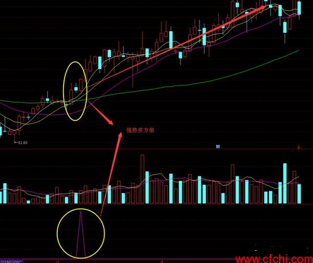 2、强势形态多方炮,K线组合是向上排列的,股价一天比一天高,从微观上来分析就是一种股价以涨代调整的强势形态,阴线实体一定尽可能短,下影线可以长些,而下影线长则是该股的收复能力强