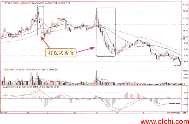 打压式出货的出现往往是因为庄家发现了突发性的利空,或者某些因素迫使庄家要迅速撤庄。由于庄家的持股成本要远远低于一般投资者,即使打压出货也可以获取丰厚的利润。
