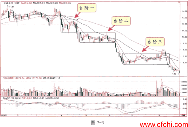 台阶式出货是通过做多个平台以达到出货的目的,每个平台的操作手法基本相同。股价见顶回落后,庄家会利用逐级下台阶的方式出货,每下一个台阶,庄家都可在盘整区域出掉不少货。若跟进者发现庄家的意图,也跟着抢抛,庄家就会再下一个台阶盘整,锁定一批套牢筹码,并造成筑底的态势,自己则慢悠悠地出货,如图所示。