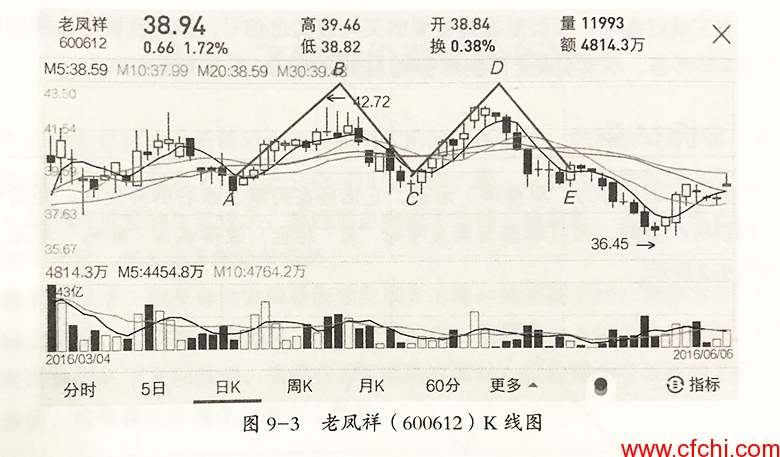 【手机案例分析】:图9-3所示为老凤祥(600612)2016年3月至6月期间的走势图,此股在持续上涨后的高位区出现了宽幅震荡的“M头”形态。由A点到B点是个上升趋势,当遇到空方阻击时,市况随即回落。在C点略作停留后,市况再次上升到另位D点,然后迅速下滑形成“M头”形态。由此可见,趋势确实已经逆转如果价格跌破E点价位,则是一个加速下跌的信号。