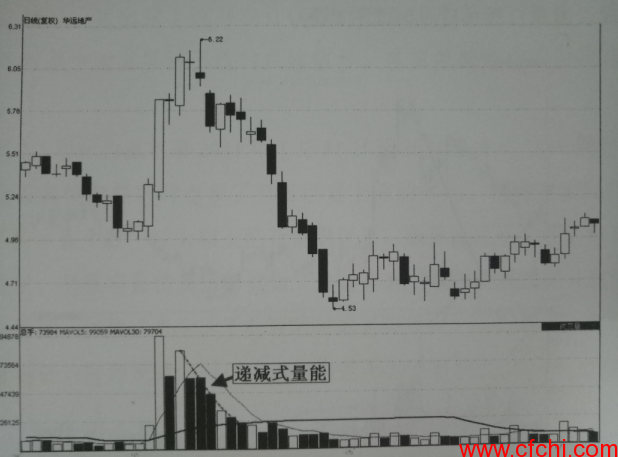 如图所示为华远地产2011年4月15日至2011年7月6日期间走势图,此股在短期内的一波上涨之后,于局部高点出现了这种递减式的量能形态,这正是多方力量不断减弱的信号,预示着这一波上涨走势并不具有持续力,在实盘操作中,股民此时应卖股离场,保住短线利润。可以看到,在递减式量能形态出现后,因买盘资金无力抵挡获利抛盘的离场,个股出现了一波深幅下跌走势。