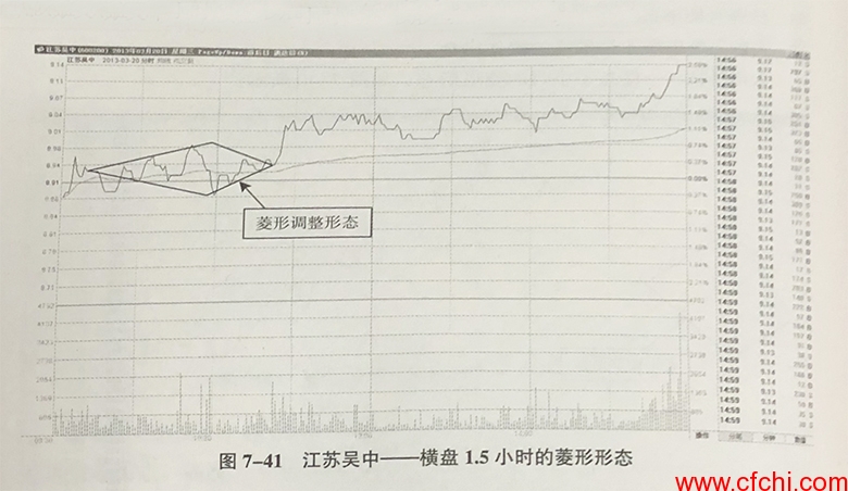 如图7-41所示,江苏吴中的分时图显示,股价在盘中的价格还是很稳健的,价格最终在盘中震荡走强,实现了上涨。图中菱形的调整形态,是股价走强的重要信号。实际上,菱形调整形态并不规范,但是投资者却能够发现股价的波动空间从小到大,再从大到小的波动过程。菱形调整形态中,价格波动趋势就是这样的。在调整形态完成以后,投资者可以在图中突破位置建仓盈利。