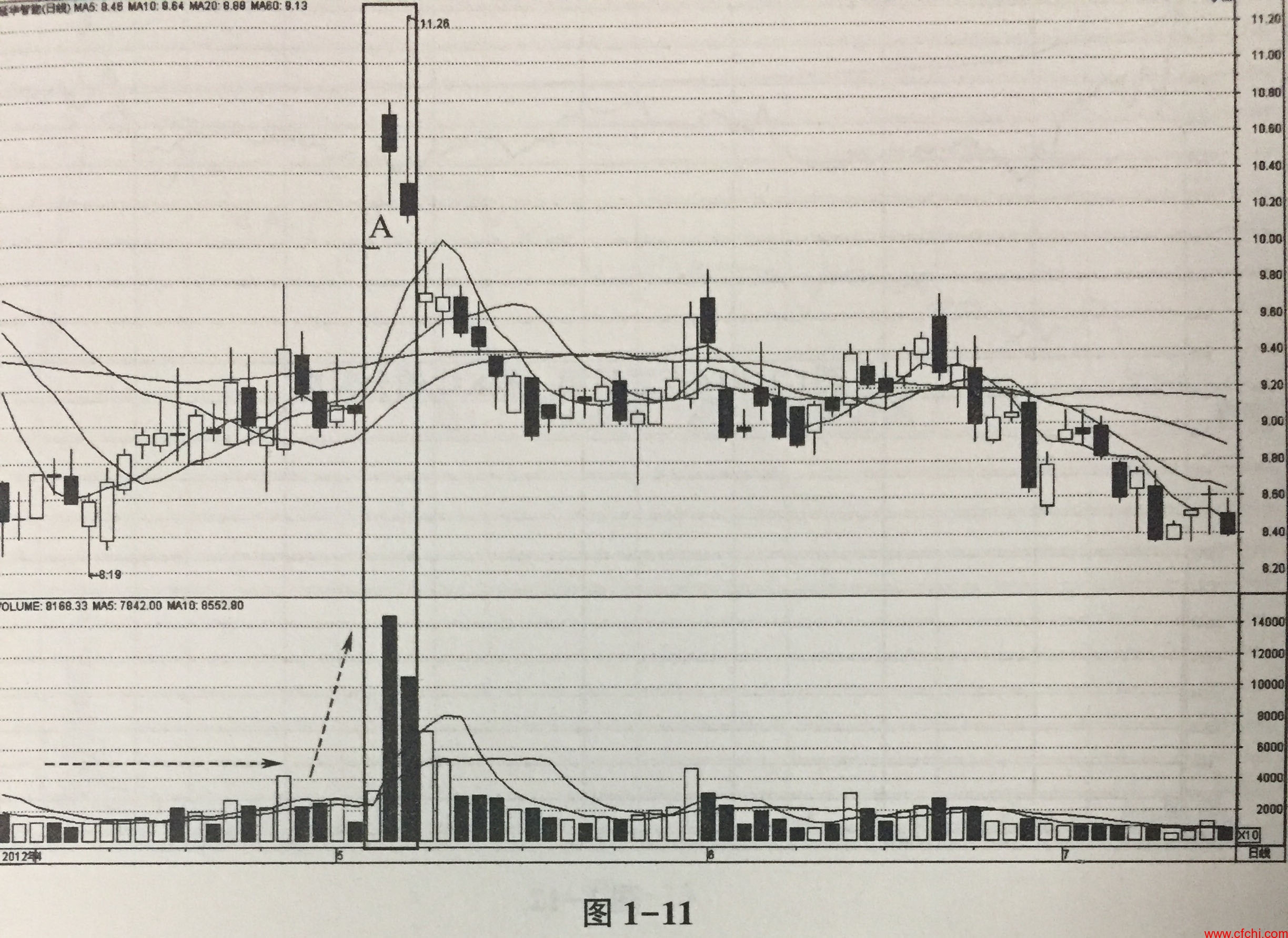 快速冲高之后,该股并没有直奔涨停板,反而逐级回落,至尾盘下跌3.33%。当天以及前一交易日买人的交易者,如果没有在该股冲高的过程中及时离场,那么必然会被套。该股后市的走势情况从图1-11中可以看到,A点仅仅是下跌趋势中的一次短暂但颇具爆发性和迷惑性的反弹。