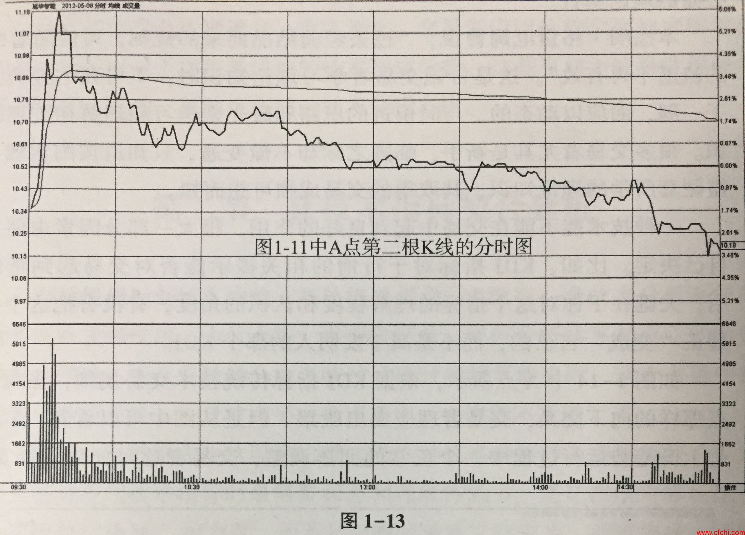 图1-12是图1-11中A点之后第一根K线即中阴线的分时走势图。基于前一交易日一字线涨停板显示出的多方强悍做多信心,部分短线资金必然非常关注该股次日开盘价和盘中的走势情况。从图1-12可见,当日股价高开后回落,10 : 00左右企稳之后一直横向盘整,并没有全部回补当天形成的向。上跳空缺口,这一点无疑给了准备介人的人一个心理上的暗示:下方有支撑,股价盘整后将会继续上涨。