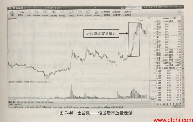 如图7-46所示,士兰微的日K线图显示,股价在日K线图中出现了反弹的情况。虽然该股刚刚放量拉升不久,但是价格回调下来以后该股再次走强,表明下方的支撑还是很强的。在这种情况下,投资者可以在股价回调的过程中短线T+0操作,依然能够获得不错的利润。股价的调整还并没有结束,价格反弹的过程中,该股的分时图中波段空间很大,投资者可以获得不错的回报。
