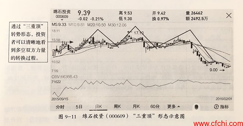 【手机案例分析】:图9-11所示为绵石投资(000609)在2015年9月至2016年2月期间的走势图,此股在持续大涨后的高位区出现了宽幅震荡的“三重顶”形态。从图中可以看出,“三重顶”形态的出现打破了个股原有的上升形态,也是其滞涨的表现,更是空方力量开始逐步积累的过程。