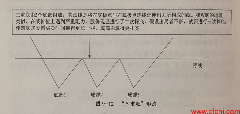 “三重底”形态是指在跌市中以三个价位大致相同的低点形成的底部反转形态,如图9-12所示。股价向上突破其颈线时,表示行情将进入一个上升期。“三重底”形态通常形成时间比较长,这也增加了股价反转的可靠性。