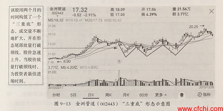 【手机案例分析】:图9-13所示为金洲管道(002443)在2015年3月至12月期间的走势图,此股在深幅下跌后的低价位区出现了宽幅震荡的“三重底”形态。从图中可以看出,该“三重底”形态的低点方位一点比一点高,而且成交量也出现逐渐扩大的趋势,三点之间构成的时间都超越10个交易日。当股价放量打破颈线时,一个完好的“三重底”构成,随后该股步入上升通道。
