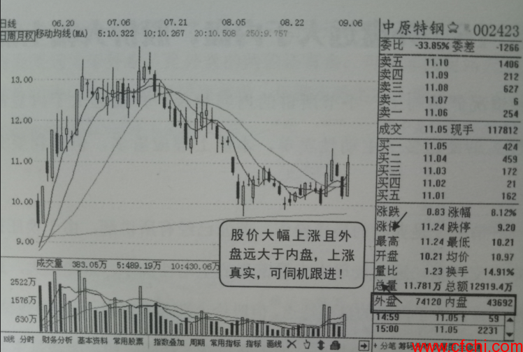 如图1所示是中原特钢(002423)某天的K线界面,图中显示该股当天出现大幅上涨,涨幅达到8个多百分点,再观察其内外盘则可发现外盘要远大于内盘,同时当天放量明显,说明上涨非常真实。另外股价当天出现了一阳穿多线的特点,短线看涨信号强烈,因此建议投资者可同机跟进。