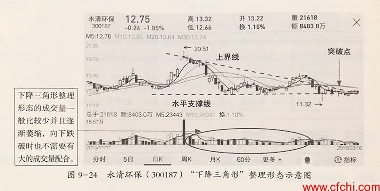【手机案例分析】:图9-24所示为永清环保(300187)在2015年11月至2016年3月期间的走势图。从图中可以看到,该股前期经过一轮的上涨之后,后期构筑了个“下降三角形”形态。构成该形态之后,股价还有一个小幅回抽的过程,结尾没能向上突破,股价持续跌落。