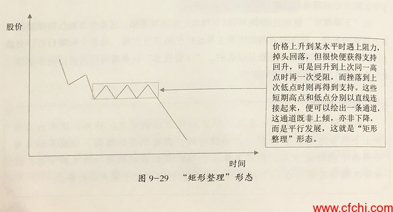 “矩形整理”形态是股价在两条水平的上下界线之间连续变动而成的形态,股价在其范围之内出现涨落,如图9-29所示。
