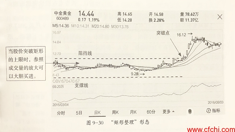 【手机案例分析】:图9-30所示为中金黄金(600489)在2016年3月至8月期间的走势图,此股在上升初期出现了横盘震荡走势,这种横盘震荡的整理形态就是“矩形整理”形态。“矩形整理”形态明显地告诉投资者,多空双方的力量在该范围之间完全达致均衡状态,在这段期间谁也占不了谁的便宜。看涨的一方认为其价位是很理想的买入点,于是股价每回落到该水平即买入,形成了一条水平的需求线。与此同时,另一批看跌的投资者对股市没有信心,认为股价难以升越其水平,于是股价回升至该价位水平便沽售,形成一条平行的供给线。