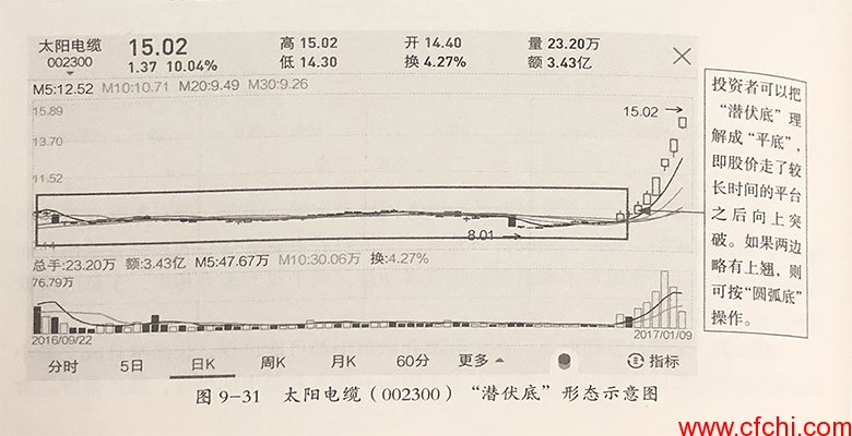 【手机案例分析】:图9-31所示为太阳电缆(002300)在2016年9月至2017年1月期间的走势图。从图中可以看出,此股股价前期在一个狭窄的区域里上下移动,既没有上升的意图,也没有下跌的迹象,给人一种沉闷的感觉。有一天,可能受到某些突如其来的利好消息,如公司盈利大增、分红前景好等刺激,该股突然出现非同寻常的大量成交,股价也脱离“潜伏底”大幅向上拉升。