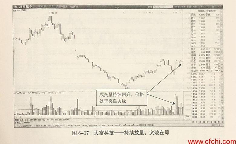 如图6-17所示,大富科技的日K线图显示,随着成交量的不断回升,该股出现了调整的情况。考虑前期放量趋势已经持续了两个月时间,这有助于股价继续放量回升。从股价的波动情况看来,图中该股短线回调。成交量的放大趋势未变,该股还会持续不断回升。投资者可以在分时图中把握住买卖机会,进行T+0的短线操作。放量回升的股票,总能提供不错的短线买卖时机。投资者在股价回升期间买卖股票,获利是没有问题的。