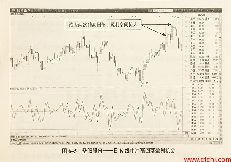 圣阳股份——日K线中冲高回落盈利机会,如图6-5所示。