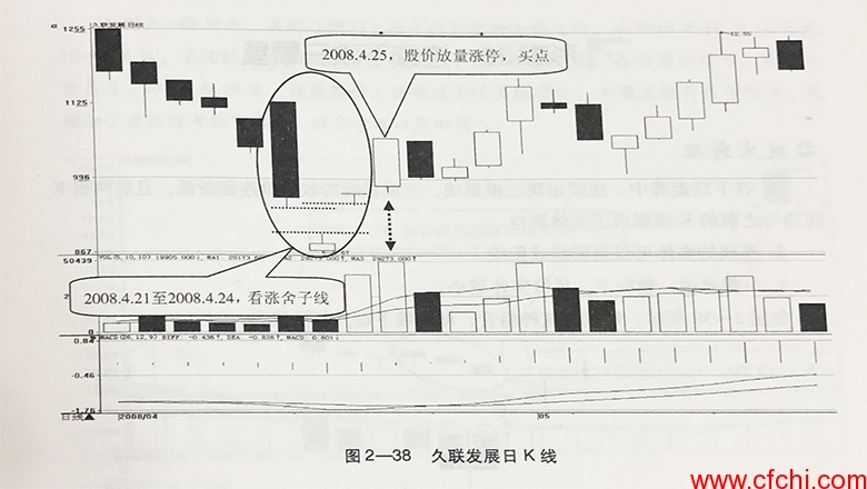 如图2-38所示,在经过前期下跌之后,从2008年4月21日至4月24日,久联发展(002037)出现看涨舍子线形态,发出看涨信号。第二个交易日,即4月25日,该股股价放量涨停,买点出现。