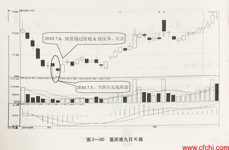 如图2-30所示,在经过一波下跌之后,2010年7月5日,重庆港九(600279)出现下跌尽头线形态,发出看涨信号。第二个交易日,即7月6日,该股股价继续上涨,越过前根K线实体,买点出现。