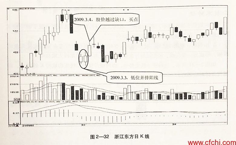 如图2-32所示,经过短期剧烈下跌之后,2009年3月3日,浙江东方(600120)出现低位并排阳线形态,发出看涨信号。第二个交易日,即3月4日,股价继续上涨,顺利越过第一根K线的缺口,买点出现。
