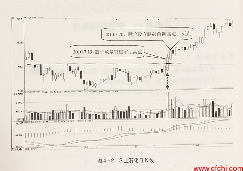 如图4-2所示,在经过前期较长时间的底部震荡后,2010年7月19日,S上石化(600688)出现股价放量突破前期高点形态,发出看涨信号。第二个交易日,即7月20日,该股股价继续上涨,没有跌破前期高点,买点出现。