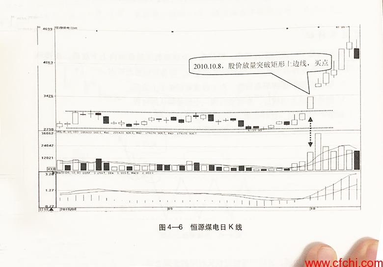 如图4-6所示,从2010年8月中旬到9月底,恒源煤电(600971)矩形形态不断地震荡。10月8日,该股股价放量突破矩形上边线,发出看涨信号,投资者要注意及时买入。