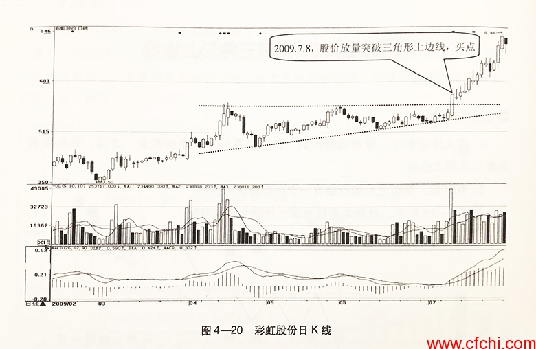 如图4-20所示,在经过一波上涨走势后,从2009年4月中旬到7月初,彩虹股份(600707)出现三角形整理形态。7月8日,该股股价放量突破三角形上边线,买点出现。