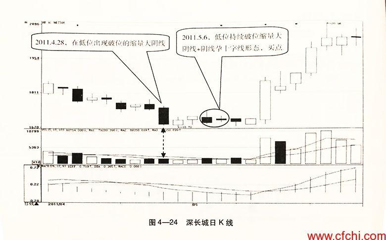 如图4-24所示,在经过一波下跌之后,2011年4月28日,深长城(000042)在低位出现破位的缩量大阴线,发出看涨信号。之后该股股价在低位不断盘旋。5月6日,该股在低位出现阴线孕十字线的看涨信号,更增加了上涨信号的可靠性,买点出现。