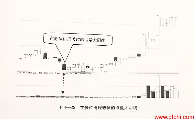 如图4-23所示,这种走势即在低位出现破位的缩量大阴线形态。