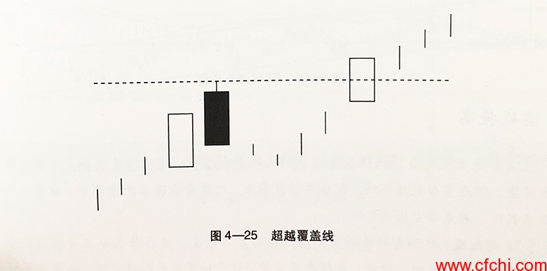 如图4-25所示,这种在上涨走势中出现,由一个覆盖线组合和一根超越线组成的组合,即超越覆盖线形态。