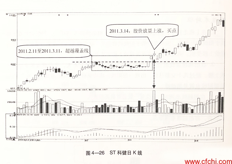 如图4-26所示,在经历了连续的上涨之后,从2011年2月11日到3月11日,ST科健(000035)出现超越覆盖线形态,发出看涨信号。第二个交易日,即3月14日,该股股价继续放量上涨,买点出现。
