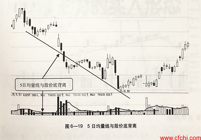 2.当股价持续下跌,连创新低的同时,如果5日均量线没有创新低,反而出现了底比一底高的上涨走势,就形成了5日均量线与股价的底背离形态。