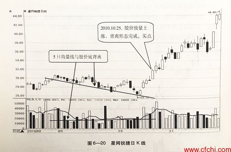 如图6-20所示,2010年9月至10月,星网锐捷(002396)股价持续下跌,不断创新低。不过在此期间内其5日均量线却没有创新低,反而出现了一底比一底高的上涨行情,二者构成了底背离形态。