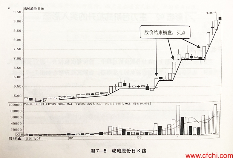 如图7-8所示,20111年2月,成城股份(600247)经过一段时间的底部横盘后进入了台阶式拉升的形态。这个形态说明主力在稳健地拉升股价,未来股价将有较大的上涨空间。每次股价结束横盘继续上涨时,都是很好的买入时机。