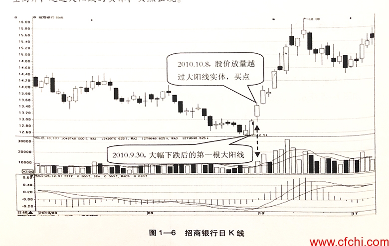 如图1-6所示,经过前期大幅下跌后,2010年9月30日,招商银行(600030)在低位出现一根大阳线,发出看涨信号。第二个交易日,即10月8日,该股放量跳空高开,越过大阳线的实体,买点出现。