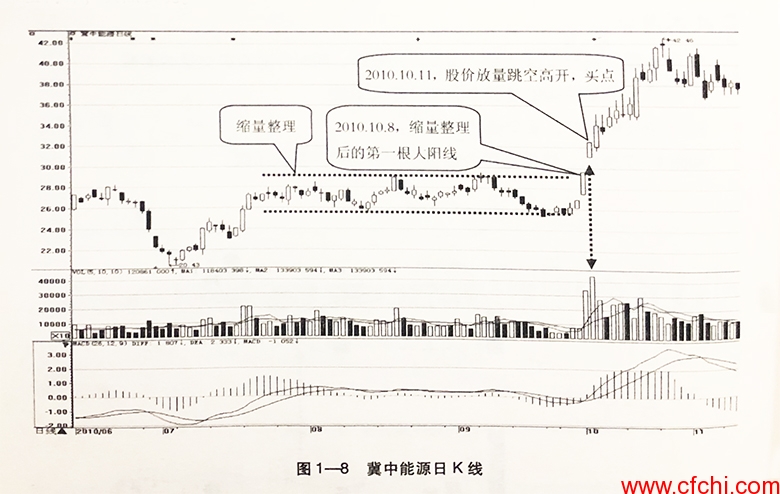 如图1-8所示,从2010年7月20日到9月30日,冀中能源(0000337)在经过前期上涨之后,出现了两个多月的縮量整理走势。2010年10月8日,该股以放量涨停的形式形成缩量整理后的第一根大阳线,发出看涨信号。10月11日,该股放量跳空高开,买点出现。
