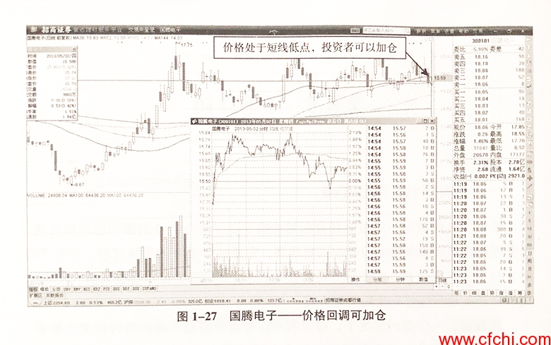如图1-27所示,国腾电子的日K线图显示,股价高位横盘期间,该股短线回调至价格低点,显然成为重要的买点。从分时图中看来,该股盘中强势震荡最终收盘出现了小幅上涨。日K线中完成了一根回升的小十字星,表明多空双方短线势均力敌。从全仓T+0操作的角度分析,投资者可以在图中建仓了。股价企稳的过程虽然一波三折,但当价格处于调整形态底部之时,建仓风险机会很小了。买入该股正好能够获得不错的回报。