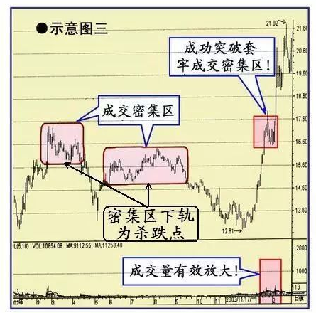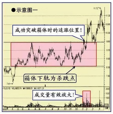 一段时间里股价在箱体里反复振荡运行,在成交量放大的配合下,股价终于突破箱体顶部、开始向上盘升,形成了比较好的买入位置(参见下图一)。