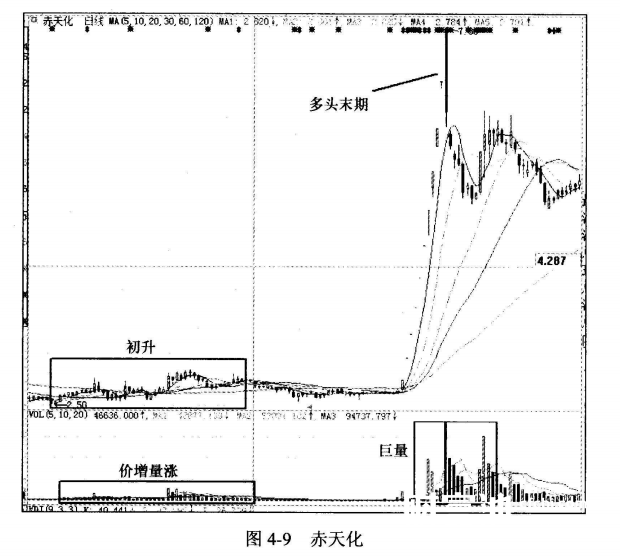 图4-9是赤天化在2014年1月~2015年2月的K线走势图。在图中我们看到了两个不同阶段的量增价涨,这也是我们在前面和大家讨论的温和放量和放巨量。这也是需要引起大家注意的。所处的阶段不同,对应的我们以后的操作也必须具体分析,不可一概而论。