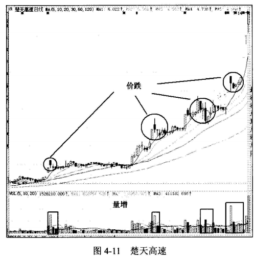 图4-11是楚天高速在2014年8月~2015年4月的K线走势图。在图中我们标出了一些典型的在洗盘过程中反映价跌量升的形态。这也是主力资金在操盘过程中常用的洗盘方法,把一根阳线做成一根阴线,通过骗线达到边拉边洗的目的。
