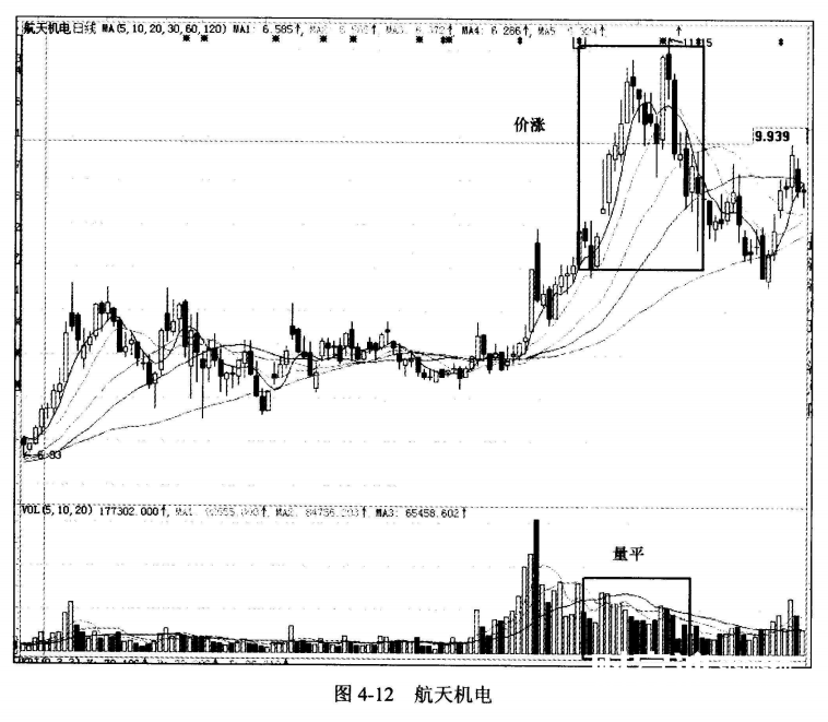 图4-12是航天机电在2013年5月~2013年11月的K线走势图。我们从图中可看到:在股价快速上涨的时候,成交量并没有放大而是维持着相对平稳。这个就是我们常讲的量与价的背离,下面的量缩价涨更是量价背离的典范。我们现在来看这只个股,其以后的行情也印证了量价背离下行情的难以为继。