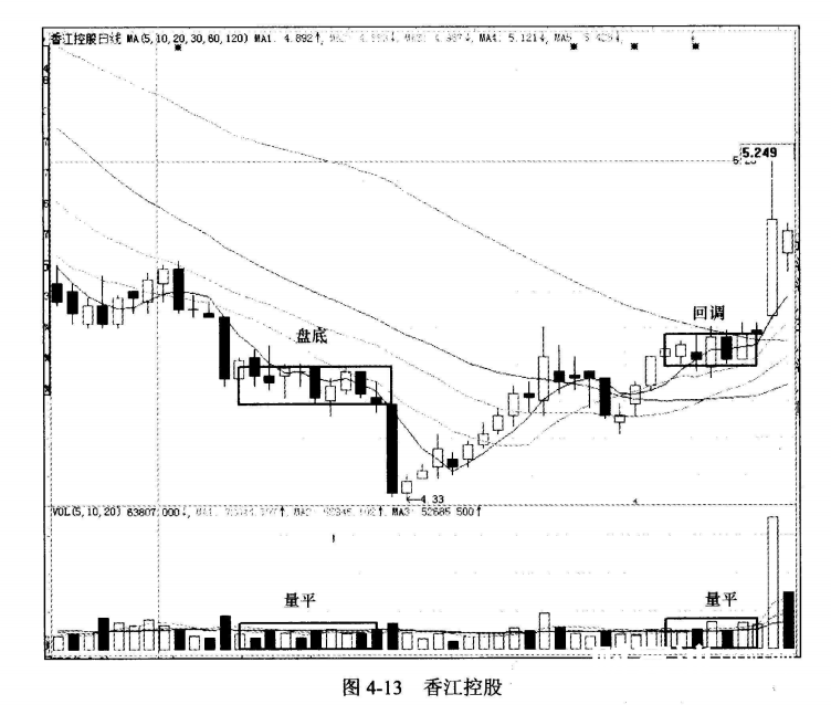 图4-13是香江控股在2014年5月~2014年7月的K线走势图。在K线图中出现了两个不同阶段的量平价平。一个是盘底阶段,一个是多头的回调阶段。在盘底阶段,股价经过量平价平的盘底后依然不改趋势,由一根大阴线继续下探。而在多头回调阶段,行情随时都存在夭折的可能,直到后期的一根放量大阳线宣告方向确立。此时可择机介入。