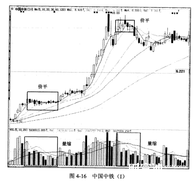 图4-16是中国中铁在2014年10月~2015年2月的K线走势图。图中的前一个量缩价平发生在多头的整理阶段,股价成交量不足,股价向下寻求支撑,在10日均线处获得支撑,重获上升动力。此时就是散户们的介入时机。