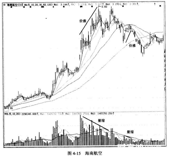 图4-15是海南航空在2014年9月~2015年3月的K线走势图。从图中我们看到有两次量缩价涨的现象,一个处于多头的末期,一个处于下跌阶段的反弹行情中。我们都可以看到,股价上涨的同时量能却是逐渐萎缩的,因为量能的萎缩股价也难以持续,最终行情出现了反转。