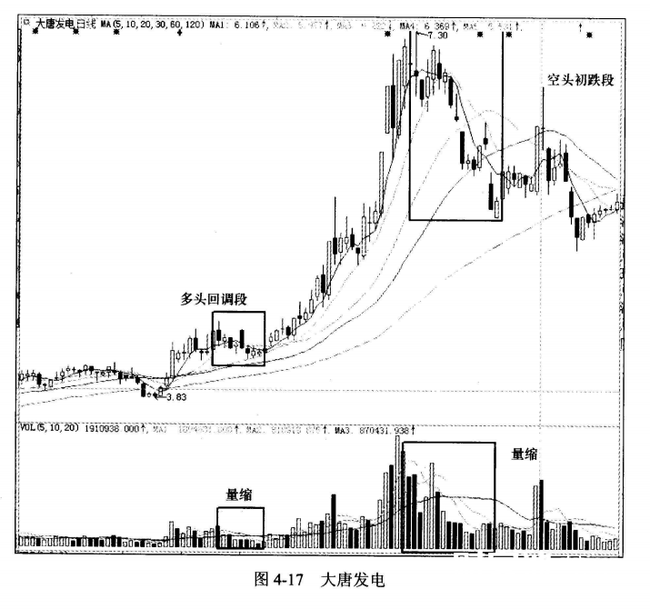 图4-17是大唐发电在2014年9月~2015年2月的K线走势图。图中出现了两个量缩价跌的量价关系,一个发生在多头回调阶段,一个发生在出货阶段。发生在多头回调阶段的量缩价跌主要是由短期的获利盘兑现获利造成的。此时的获利兑现会造成股价短期抛压,但会提高散户的平均持股成本,有利于以后股价的拉升。
