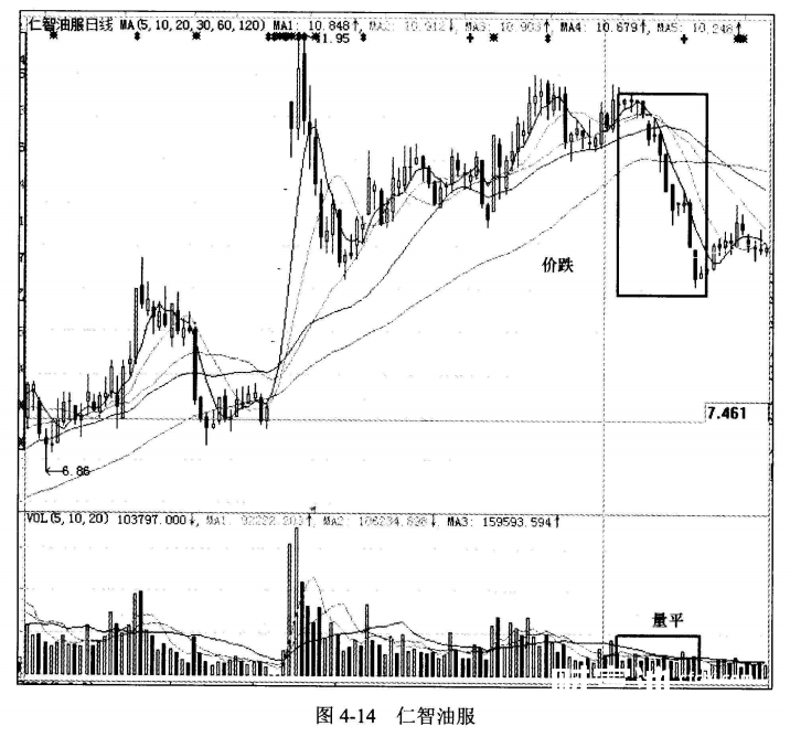 图4-14是仁智油服在2013年11月~2014年11月的K线走势图。K线走势从2014年09月26日起连续量平下跌,股价从11.20元跌到了低点时的9.00元,让没有及时出逃的散户朋友损失严重。