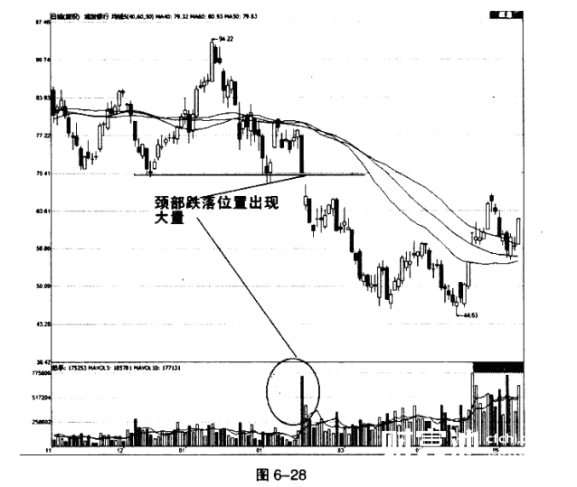 该图中标示出的第二处与第一处同理,为价格小幅反弹后又向下跌破支撑的位置。这些跌破人们心理防线的价格都会带来放大的成交量,且后市仍然看跌一线。