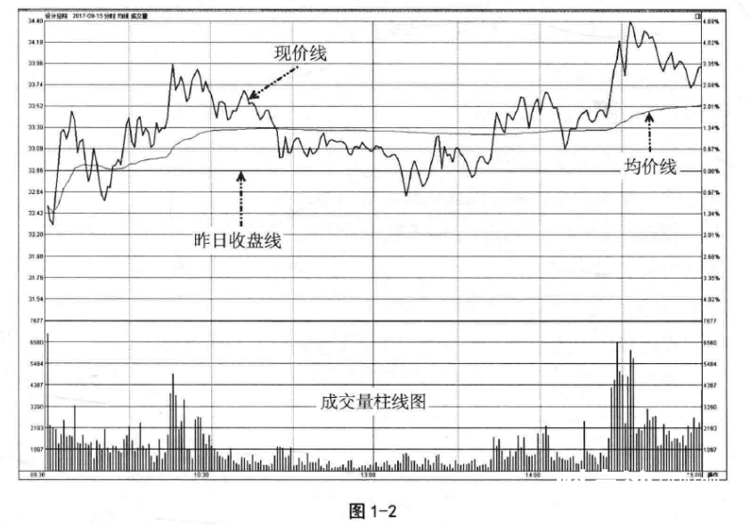 如图1-2所示,上方为分时图中的现价线、均价线、昨日收盘线,下方为成交量柱线图。