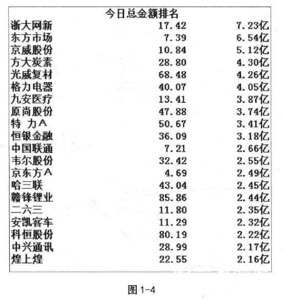 在常用的交易软件上,都会有今日总金额排名(如图1-4所示)。分析今日总金额排名,可以知道即时交易金额最大的股票是哪些,收盘后全天交易金额最大的股票是哪些,盘中显示即时交易金额最大的股票在收盘后是否有变化,交易金额较大的股票是处于上涨,还是处于下跌的态势中。