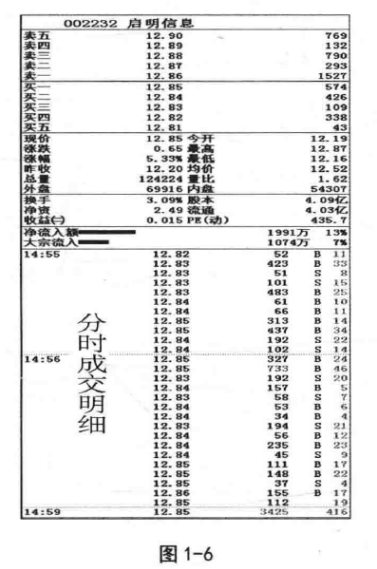 在常用交易软件行情信息区的下方,是个股的分时成交明细,也被称为成交回报。在分时成交明细里,可以看到每分钟、每笔成交单的情况,如图1-6所示。