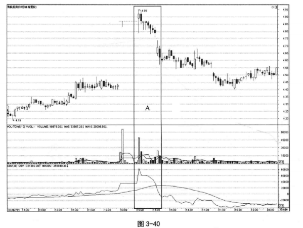 如图3-40所示,A区域OBV的急速上升与急速下跌,能够较好地反映出股价走势。图3-40为30分钟K线图OBV在股价短期波动上的反应与提示信号,具有重要的参考价值。